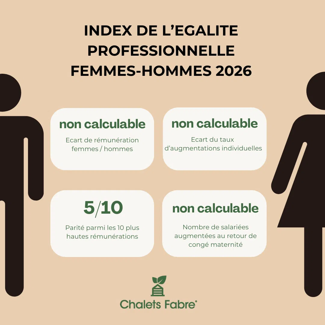 Chalets Fabre a à cœur de garantir l'égalité entre les femmes et les hommes dans tout le champ professionnel : égalité salariale, égalité des chances et absence de discriminations liées au genre de quelque ordre que ce soit.