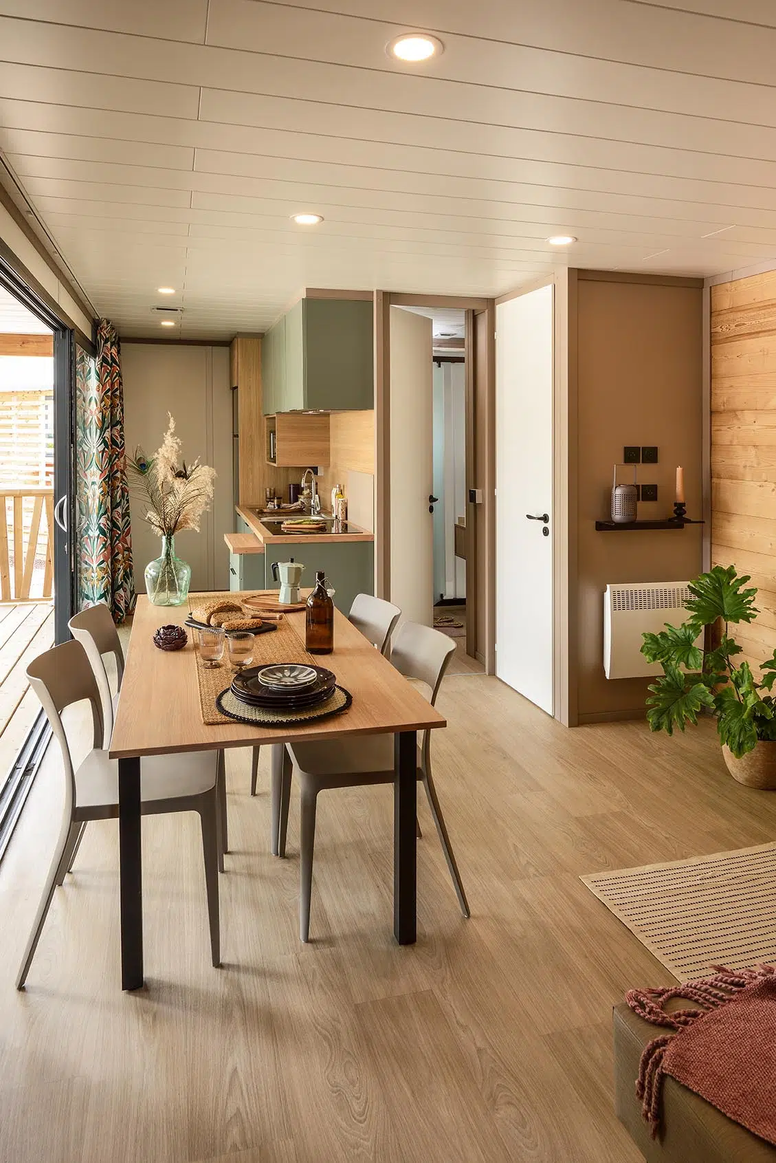 Orientée vers l’extérieur, la cuisine de ce chalet donne directement accès à la terrasse qui devient une pièce à part, un lieu de protection et de convivialité. Les modèles proposent une implantation dans la largeur de la parcelle qui conviendra aussi parfaitement aux installations en restanque. L’intérieur des chalets laisse place à la liberté, au confort et à la lumière avec des espaces conçus pour favoriser la fluidité de circulation, des ameublements solides et des teintes de chêne et d'eucalyptus qui se marient pour former un mélange lumineux.