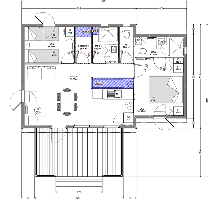 Découvrez tous les atouts de la gamme Résidence, offrant 49m² d'élégance avec une terrasse en façade. La salle de douche et les WC sont séparés par un couloir, offrant une meilleure organisation.