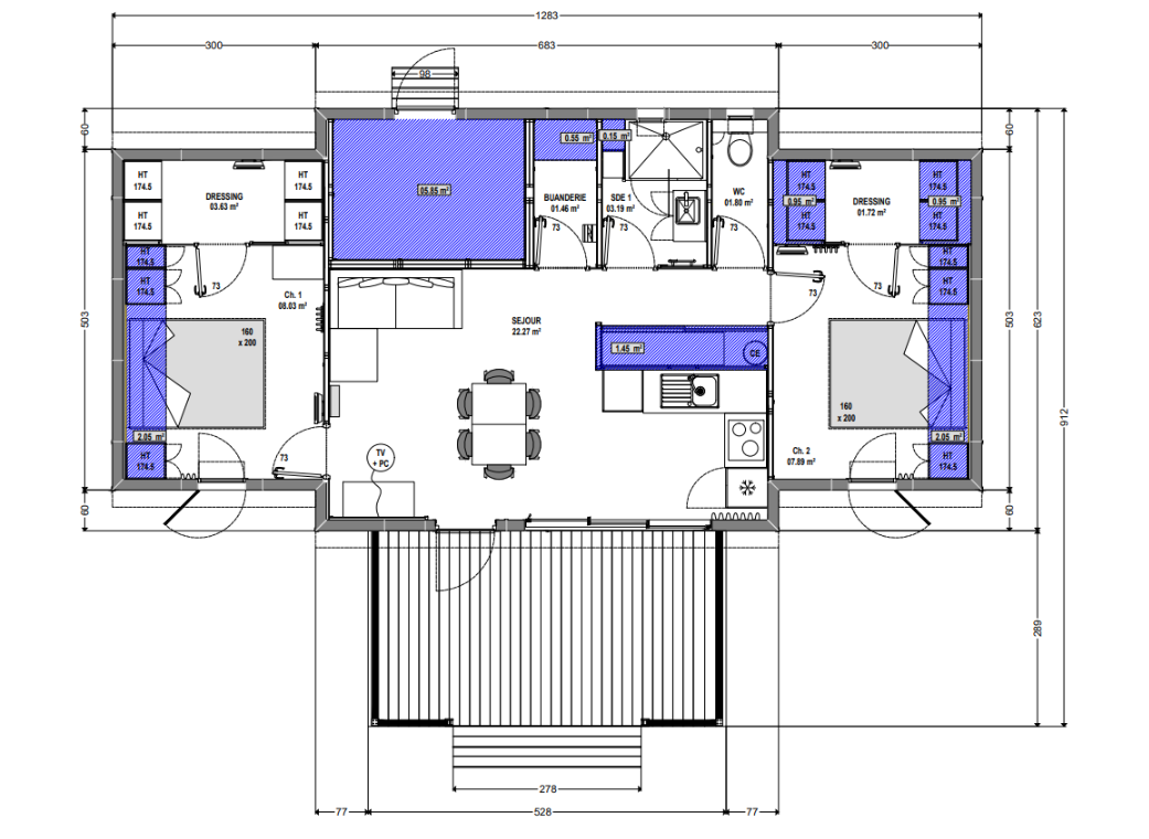 Résidence 63-2 - Façade - Ch gauche + SDE - Ch droite + dressing - 1 pente - Terrasse pergola