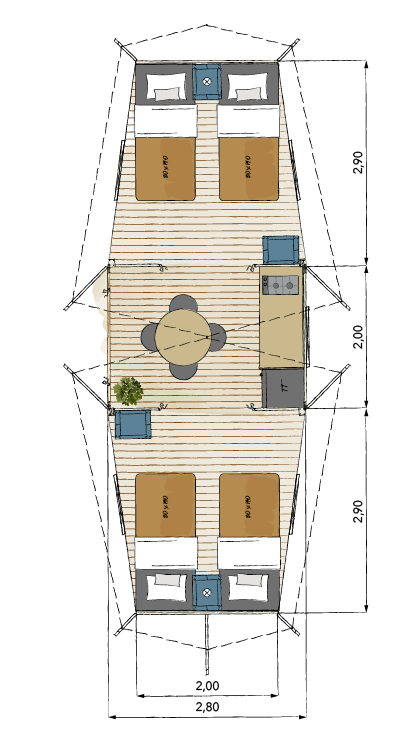 Pour accueillir les familles ou les séjours entre amis, optez pour notre modèle plus généreux avec 2 chambres pouvant recevoir jusqu’à 4 personnes, ainsi qu’un espace cuisine convivial !