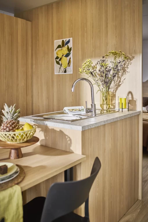 Un sas sépare la pièce nuit de la pièce de vie, la terrasse intégrée permet de profiter de l’extérieur avec une grande ouverture sur pignon.