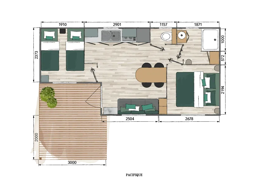 Une terrasse de 10m2 est intégrée au modèle, le séjour est convivial et et la chambre parentale peut accueillir un lit bébé.