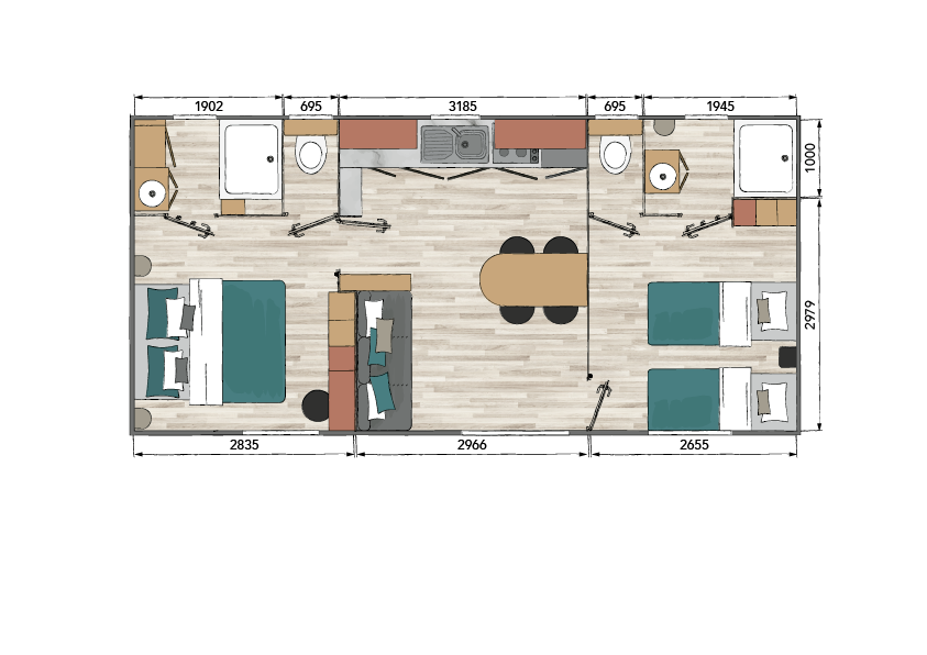 Les 2 chambres disposent de salles d’eau et WC privatifs pour plus de confort et d’intimité. Un emplacement est prévu dans la grande chambre parents pour installer un lit bébé.