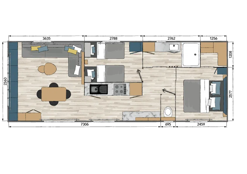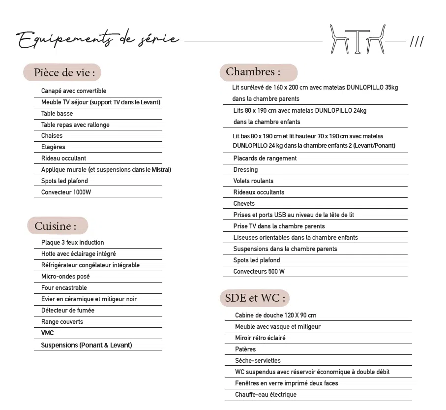 Le séjour bordé de grandes baies vitrées offre une sublime luminosité et donne le sentiment d’un lieu très aéré et spacieux. La cuisine est ouverte directement sur la terrasse ce qui est d’une grande praticité et induit une grande simplicité au quotidien. Les deux espaces « nuit » sont séparés de l’espace de vie de façon nette pour garantir un meilleur confort. Les espaces de rangement ne viennent pas à manquer dans ce mobil-home résidentiel Louisiane, comme entre autres le magnifique dressing dont est dotée la suite parentale.